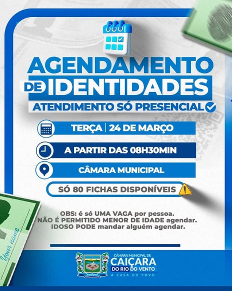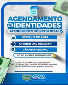 Mais um agendamento presencial para emissão de identidades ocorrerá na próxima sexta-feira, 10 de abril, na Câmara Municipal. IMPORTANTE ⚠️ …